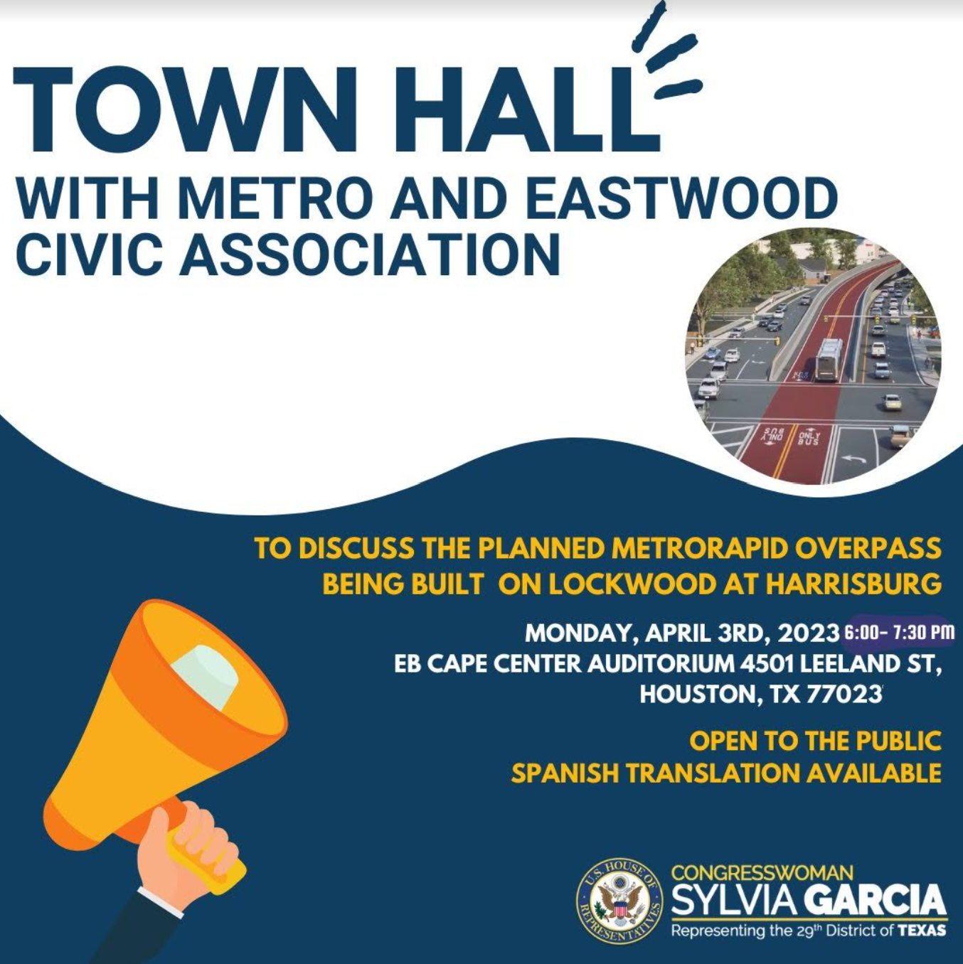 METRO planea responder preguntas sobre los diseños de sus proyectos en un ayuntamiento comunitario organizado por la representante Sylvia García el lunes 3 de abril en el E.B. Cape Center, 4501 Leeland St., de 6:00 p. m. a 7:30 p. m. Esperamos ser anfitriones de METRO para conversaciones vecinales adicionales muy pronto. Hay muchos elementos en este proyecto que tendrán un impacto en nuestro vecindario y lo alentamos a aprender más para que pueda ofrecer sus opiniones a los planificadores de METRO.